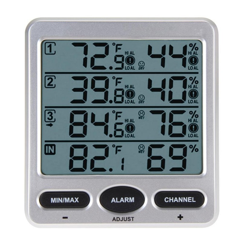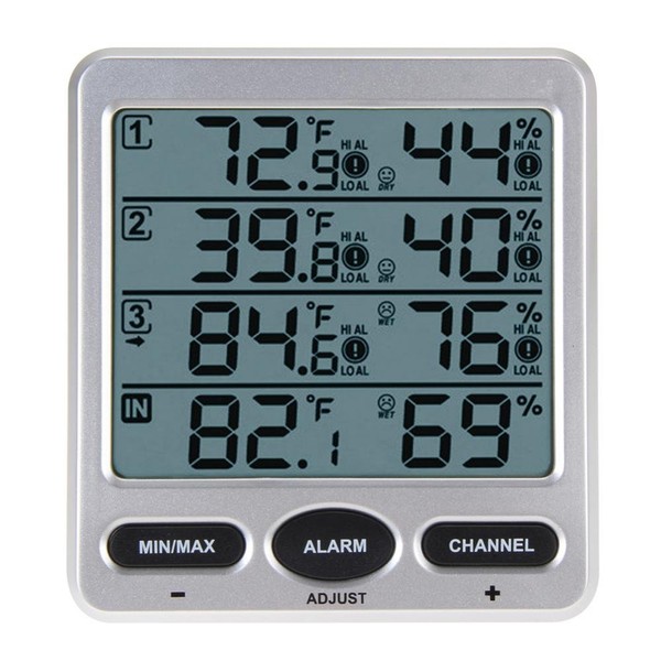 - The console includes audible and visual alarms when temperature and humidity exceed your pre-set minimum and maximum alarm settings.