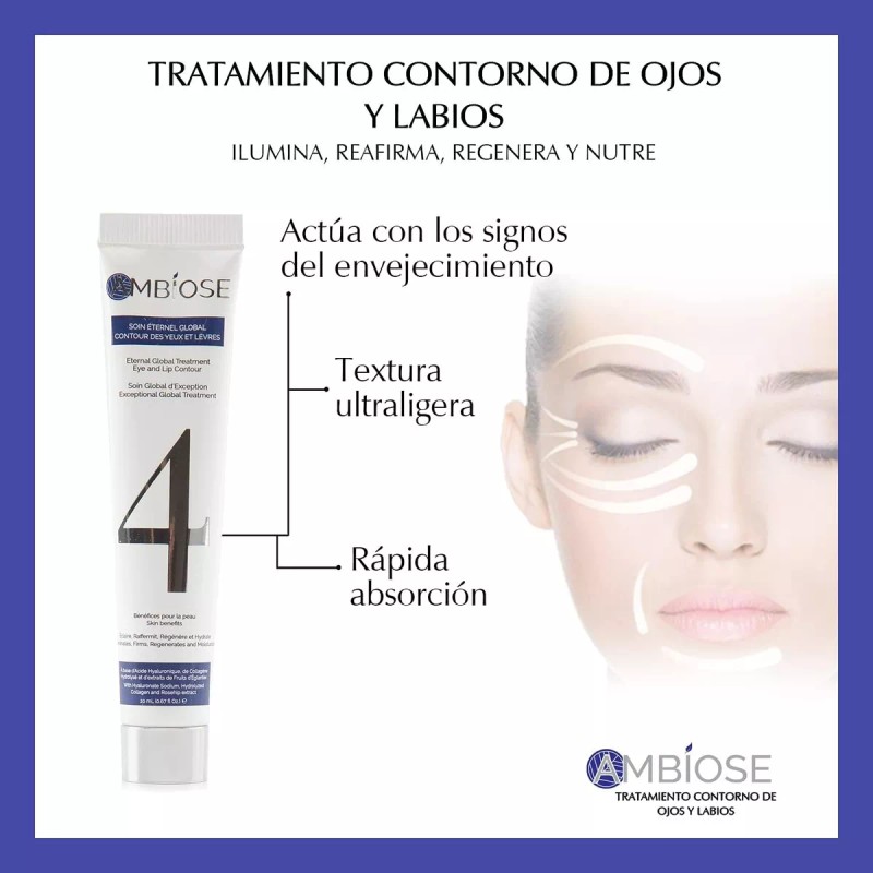Te dejará con una piel firme, lisa y relajada Descripción: El Tratamiento Eterno Global Contorno de Ojos y Labios Ambiose es un tratamiento intensivo antiarrugas y reafirmante.