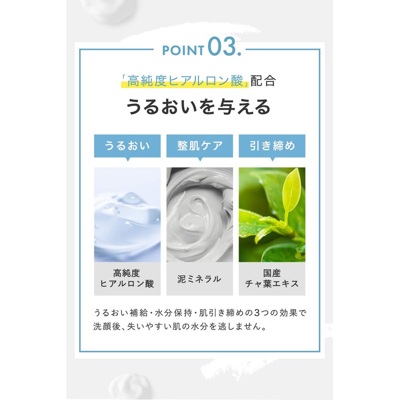 - (Moisture Retention) Formulated with high-purity hyaluronic acid, mud minerals, and Japanese cha leaf extract. 3 effects: moisturizing, moisture retention, and skin tightening to keep moisture away from your skin that is easily lost after washing your face