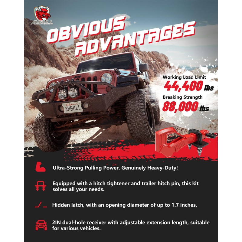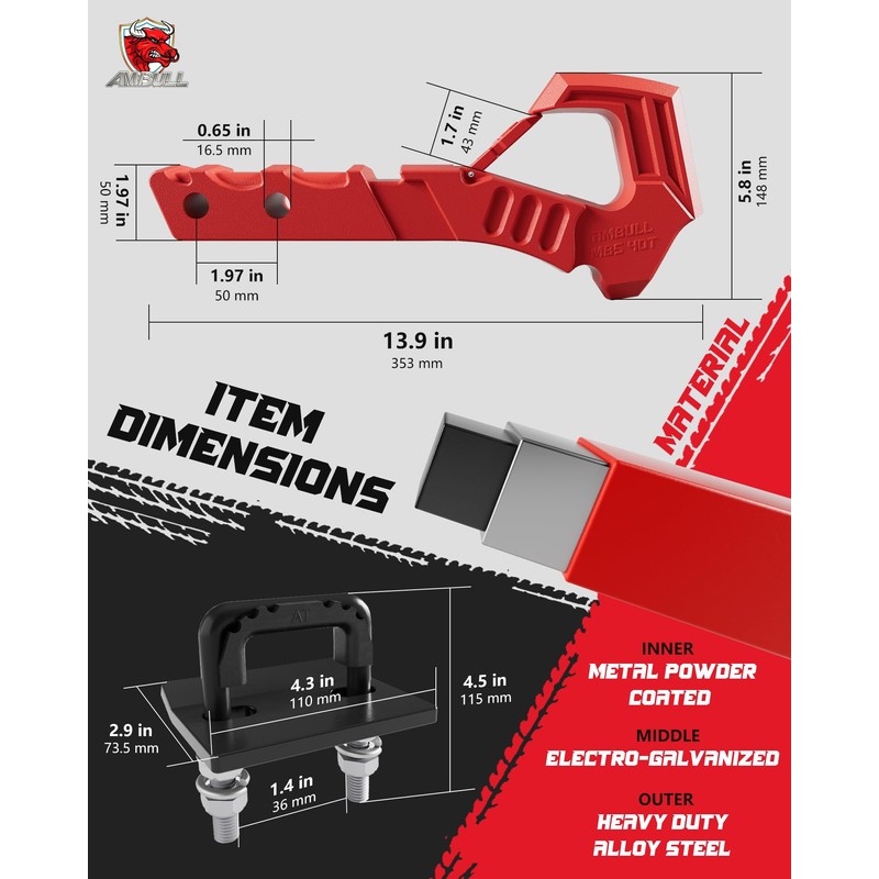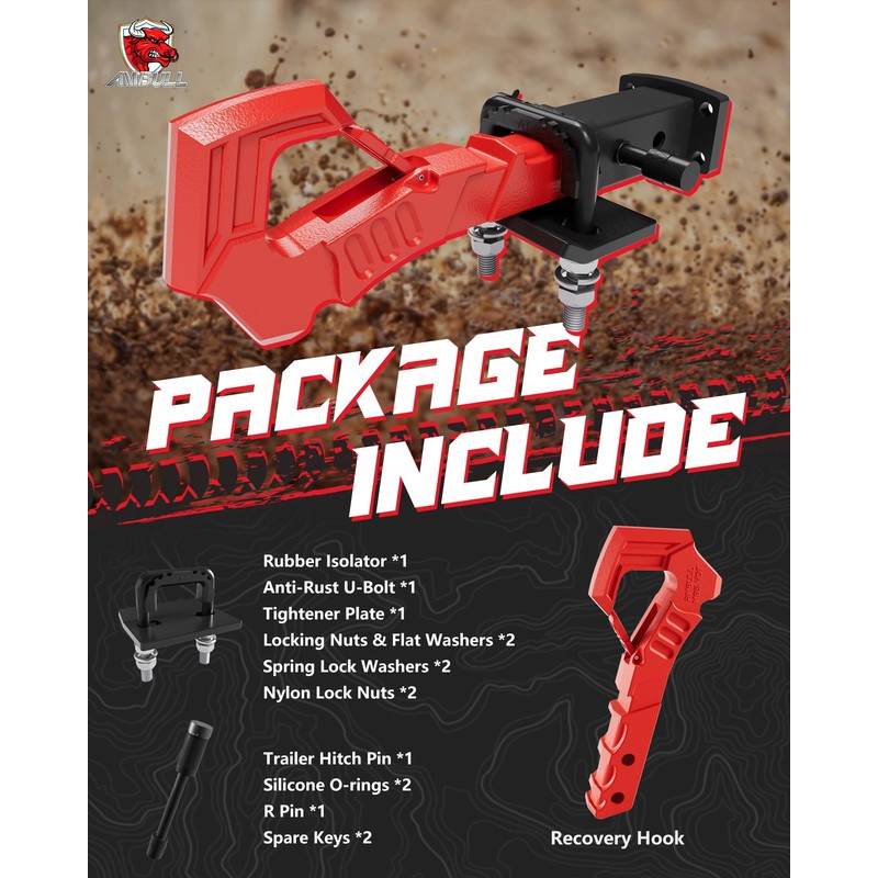 - MATERIAL: AMBULL Tow Hitch Receiver Hook with Hitch Tightener and Trailer Hitch Pin is made of heavy-duty drop forged steel. It is zinc-plated and powder-coated for enhanced durability, capable of withstanding extreme weather conditions