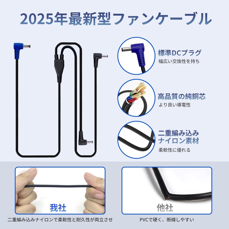 • (Double Braid Nylon) Air conditioned work clothes fan cord is made of double braided nylon. It is 20% more durable than PVC but still has good flexibility