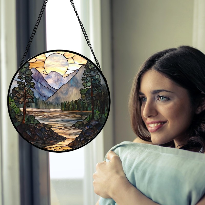 AMDERVEN Stained Glass Window Hanging, Sunset Mountains Lake Tree Sun Catcher for Window Home Decor Landscape Suncatcher Mother's Day Birthday Gifts for Women Men Mom and Nana 9.8 in