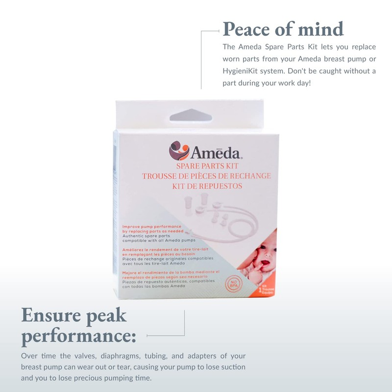 - PEACE OF MIND: The Ameda Spare Parts Kit lets you replace worn parts from your Ameda breast pump or HygieniKit system. Don't be caught without a part during your work day! With the spare parts kit, you'll always have the part you need to keep pumping.