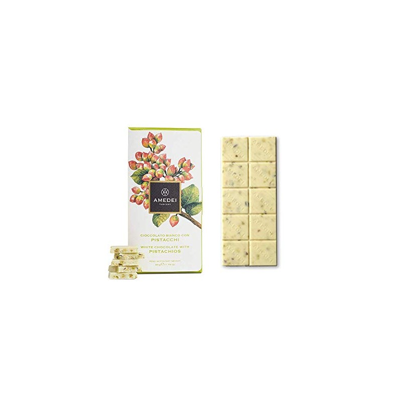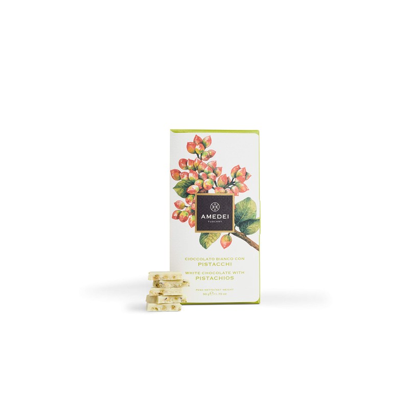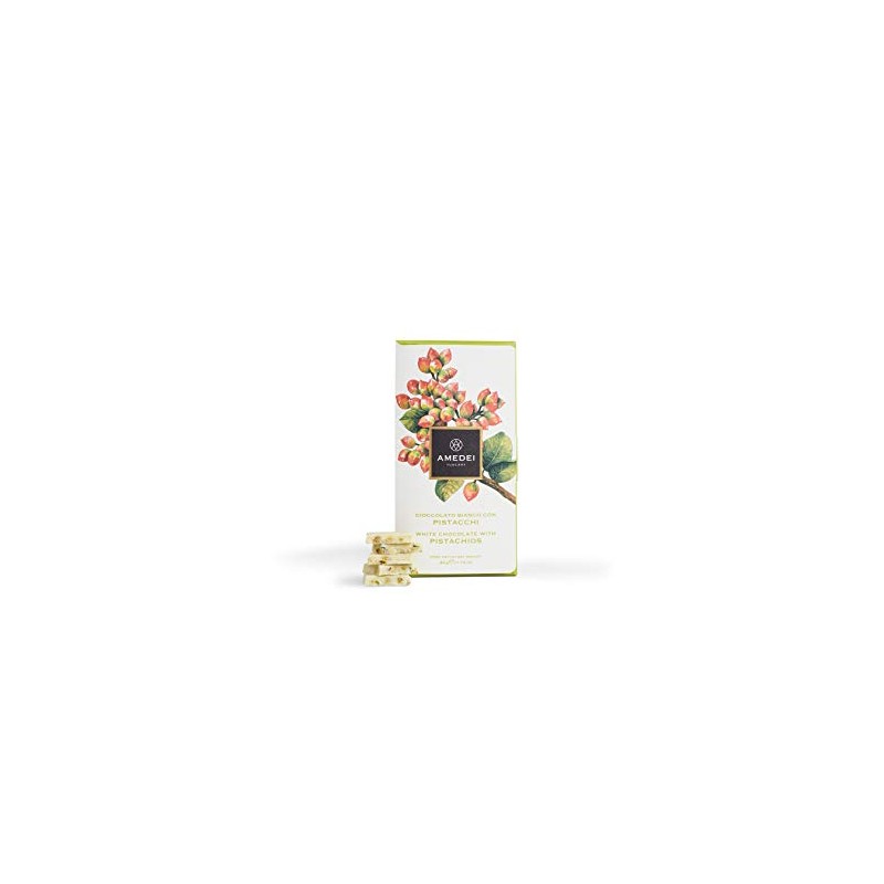 Ingredients: cane sugar, cocoa butter, whole milk powder, pistachios (10%), vanilla. Cocoa min. 29%. May contain traces of hazelnut, almond, walnut. Storage: keep in a dry and cool place, max 18°C (64°F). Taste at room temperature. Net weight: 50g / 1.75oz