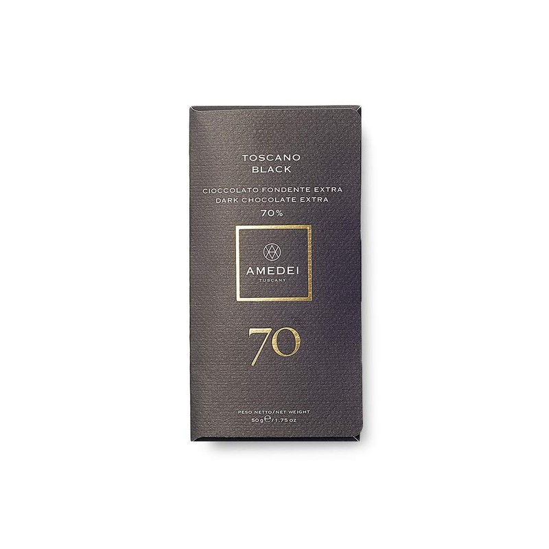 Toscano Black, the "Manifesto" dark chocolates from Amedei. These chocolates are made from a blend of Trinitario and Criollo. With different percentages of cocoa,they evoke the unique nuances of masterfully blended beans in an encounter with classic chocolate featuring a crisp cracking sound and clean palate. The inviting,genuine aroma of the 70% blend dominates,with traces of tobacco and toasted malt in the background. The first bite offers a surprise as a powerful structured flavour makes its entrance after a delicate first impression.