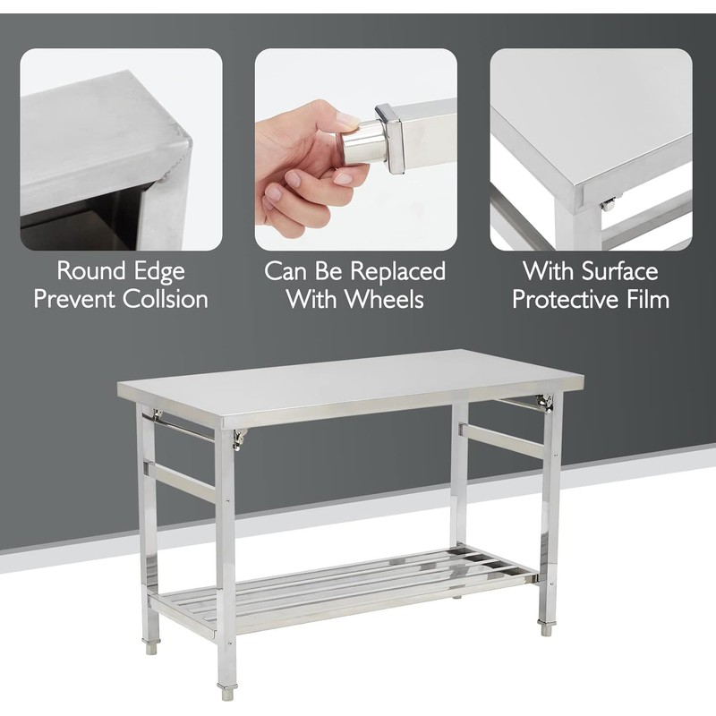 Premium Stainless Steel: Crafted from high-quality stainless steel, this kitchen work table is rust-resistant, durable, and easy to clean and sterilize—outperforming wood or glass prep tables for hygiene and longevity.