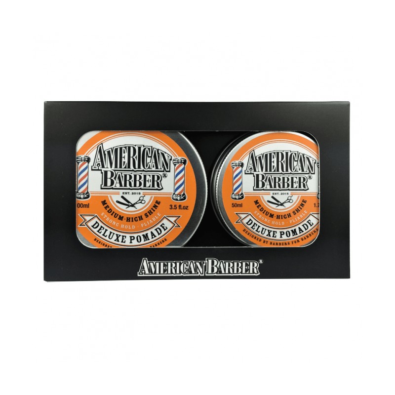 American Barber Deluxe Pomade 50ml-100ml Duo Pack makes it easy to create and control your desired style with a medium-high shine finish and a strong but pliable hold.