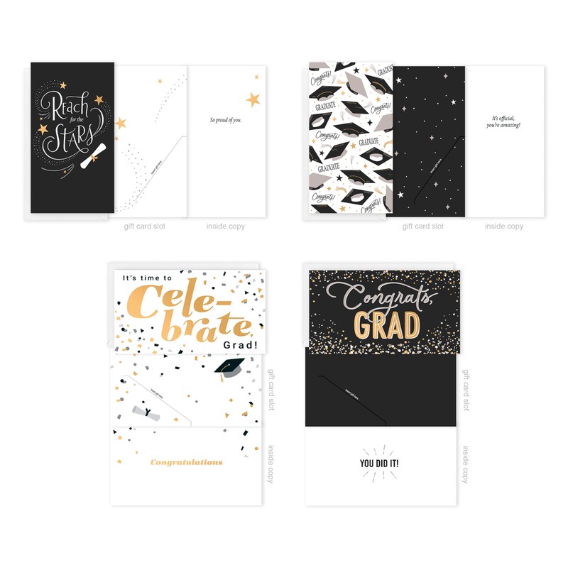 - This graduation card assortment includes 12 cards, 3 of each 4 designs, each with a special message inside and a slot to hold the gift of cash, check, or gift card