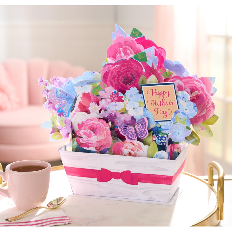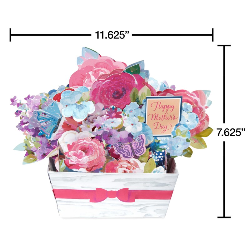- This exquisite pop-up card transforms into a vibrant display of colorful flowers in a charming wood-effect box, complete with butterfly and floral embellishments