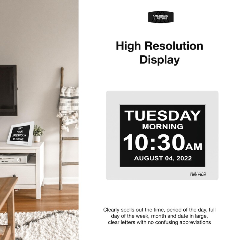- Key features - This unique 7 inch high resolution digital alarm clock clearly spells out the time, period of the day, full day of the week, month and date in large, clear letters with no confusing abbreviations