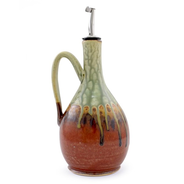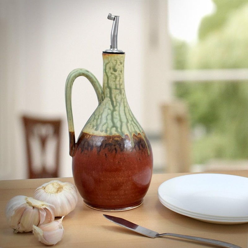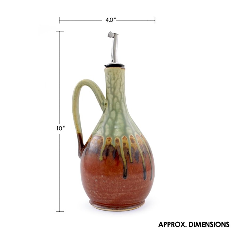 American Made Artisan Stoneware Pottery Wide Body Oil Cruet Bottle with Handle in Earthy Red Sage, 26 Oz