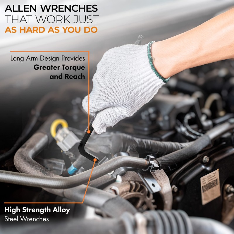 - Ergonomic: Our angled allen wrench design helps you tighten l wrench set screws in tight places. The ball end allen wrench set easily fits into most tool pouches and the metric allen wrenches set high visibility orange color makes this hex wrench set easy to spot.