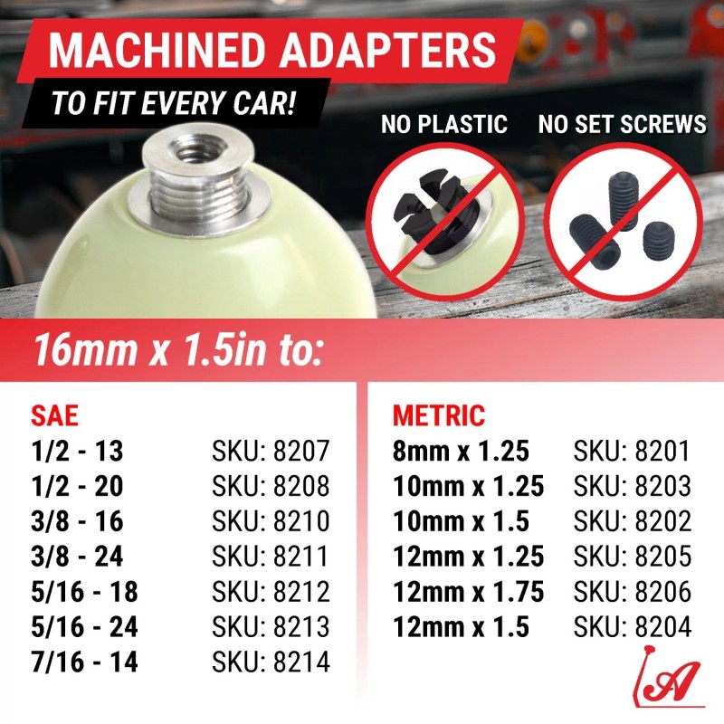 These adapters come with common industry standard M16 x 1.5 threads which fit most of our 1000s of shift knobs. Other adapters based on (M16 x 1.5) are available in both SAE and Metric formats so you can fit any knob to any car.