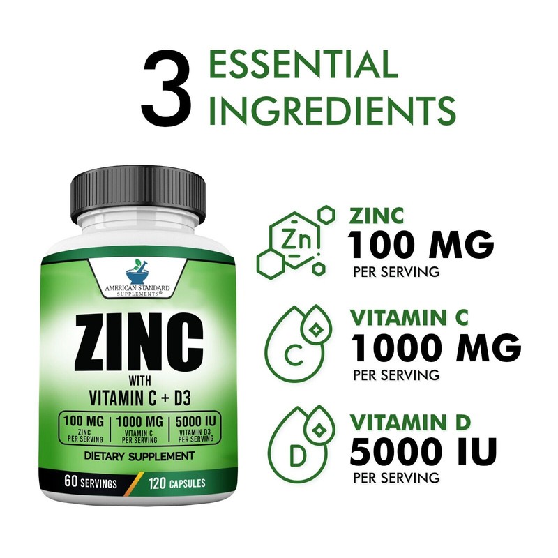 American Standard Supplements Zinc 100mg, Vitamin C 1000mg, Vitamin D3 5000IU  per Serving, Immune Support