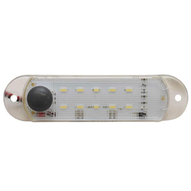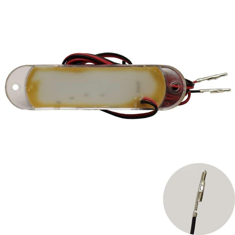 This dome light is constructed out of clear plastic with white LEDs. It measures approximately 4 1/2" L x 1" W x 1/2" H overall. Mounts with (2) 1/8" Dia. mounting holes set apart 4" center to center. Rated for 12V and connects with (2) raw wire leads.