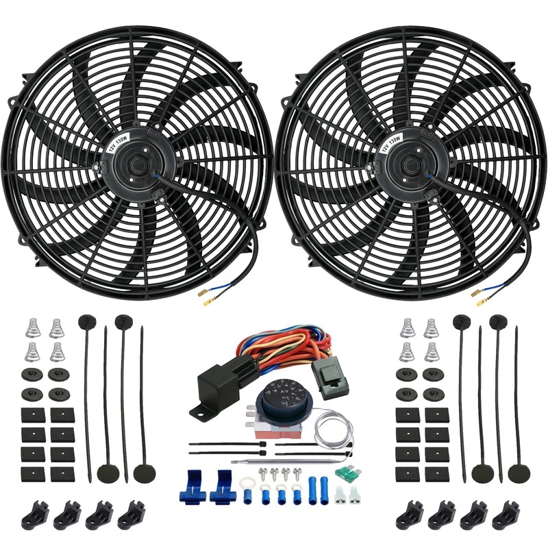 American Volt Dual 16-17 Inch 130w High CFM Motor Electric Radiator Cooling Fan Adjustable Thermostat Switch Controller Wiring Kit