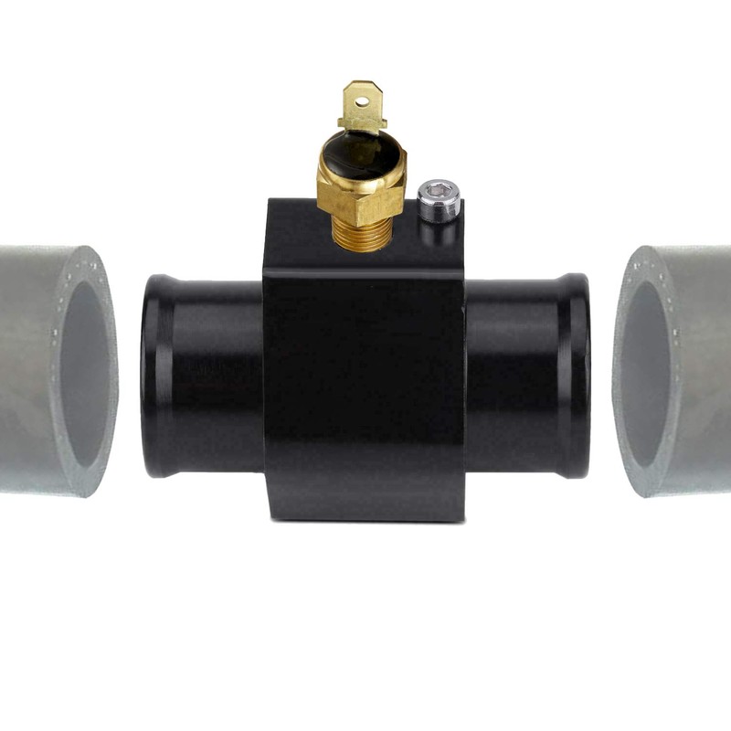 Radiator hose joint adapter and thermostat switch. Universal fit for any car, truck or automotive project. Activates fan by grounding at preset temperature. 1/8" NPT thread-in brass probe thermostat. Installation instructions included.