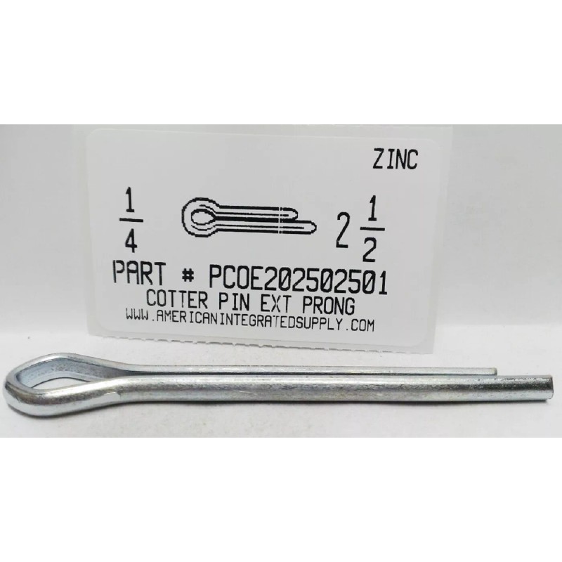 1/4X2-1/2 COTTER PINS EXTENDED PRONG STEEL ZINC PLATED. These are also available by the piece at our web site. All items are packaged in heavy duty ziptop bags and well labeled, perfect size for bin restocking! We carry 1000's of other fasteners in stock for immediate shipment. We have over 50 years of experience serving Metro Detroit. Send us your requirements. For prompt Quotations, E-mail; sales at americanintegratedsupply dot com or visit us at; www dot americanintegratedsupply dot com