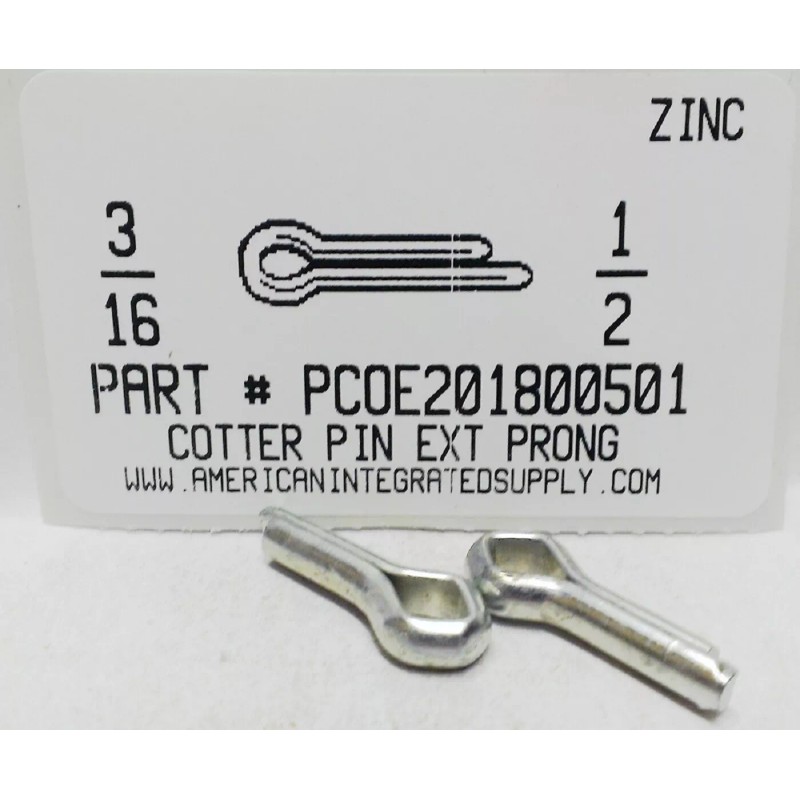 3/16X1/2 COTTER PIN EXTENDED PRONG STEEL ZINC PLATED. All items are packaged in heavy duty ziptop bags and well labeled, perfect size for bin restocking! We carry 1000's of other fasteners in stock for immediate shipment. We have over 50 years of experience serving Metro Detroit. Send us your requirements. For prompt Quotations, E-mail; sales at americanintegratedsupply dot com or visit us at; www dot americanintegratedsupply dot com |