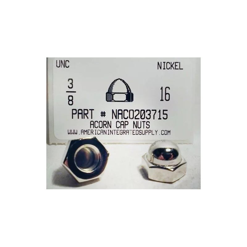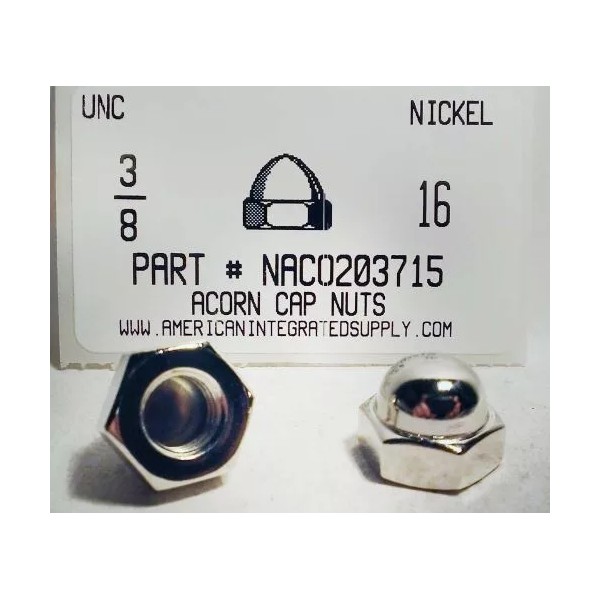 3/8-16 Acorn Cap Nuts Zinc Alloy Nickel Plated. These are also available by the piece at our web site. We also carry flat and lock washers to match. All items are packaged in heavy duty ziptop bags and well labeled, perfect size for bin restocking! We carry 1000's of other fasteners in stock for immediate shipment. We have over 50 years of experience serving Metro Detroit. Send us your requirements. For prompt Quotations, E-mail; sales at americanintegratedsupply dot com or visit us at www dot americanintegratedsupply dot com
