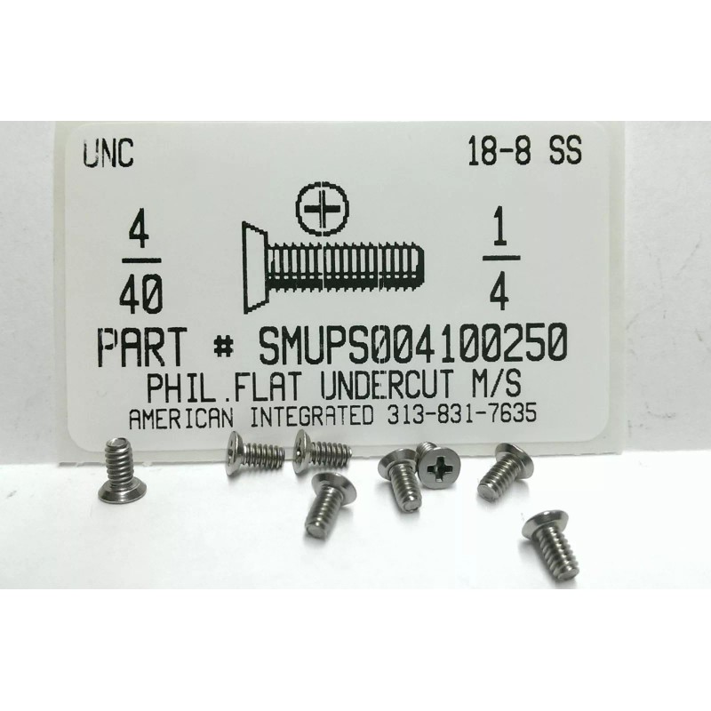 #4-40x1/4 Flat Undercut Head Phillips Machine Screws 18-8 Stainless Steel. These are also available by the piece at our web site. Larger quantities are available, Please inquire. We also carry nuts and washers to match. All items are packaged in heavy duty ziptop bags and well labeled, perfect size for bin restocking! We carry 1000's of other fasteners in stock for immediate shipment. We have over 50 years of experience serving Metro Detroit. Send us your requirements. For prompt Quotations, E-mail; sales at americanintegratedsupply dot com or visit us at; www dot americanintegratedsupply dot com