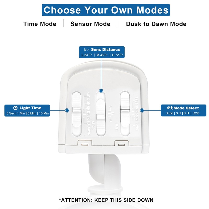 - Motion Sensor AUTO Mode - Our lights have daylight and motion sensor, the motion is detected with 180 degrees swiveling angle, sensing light levels and motion up to max 72 feet. Auto ON for pre-determined time(1/5/10MIN) when people or other living objects are detected within the sensing area, and Auto OFF after no further motion is detected. Built-in PIR motion sensor of our outdoor lights, it has a long-range of distance and a wide-angle for motion detection.