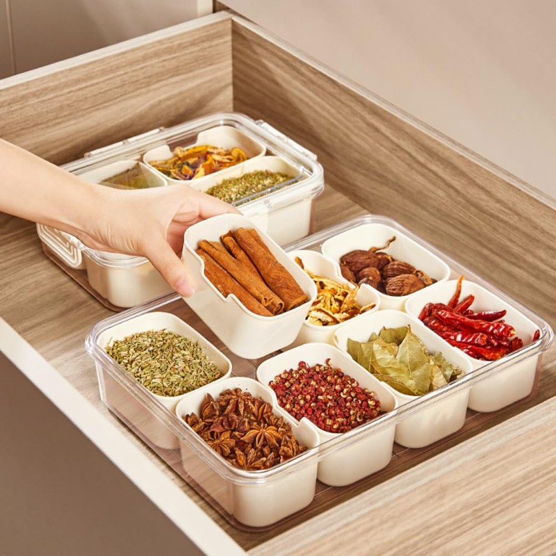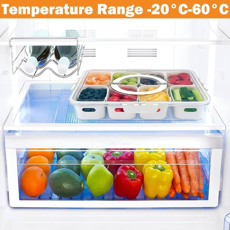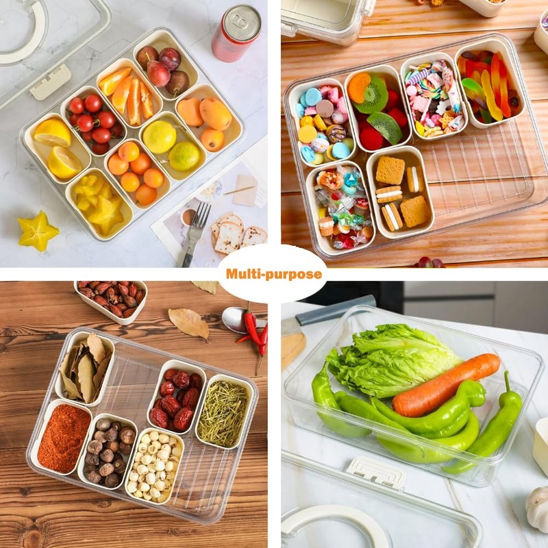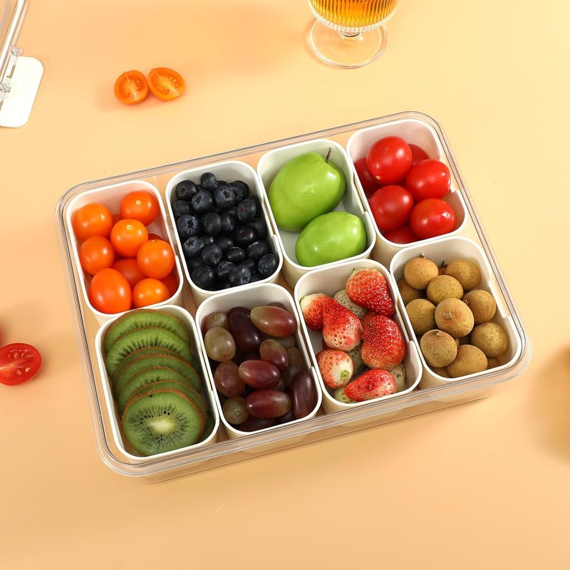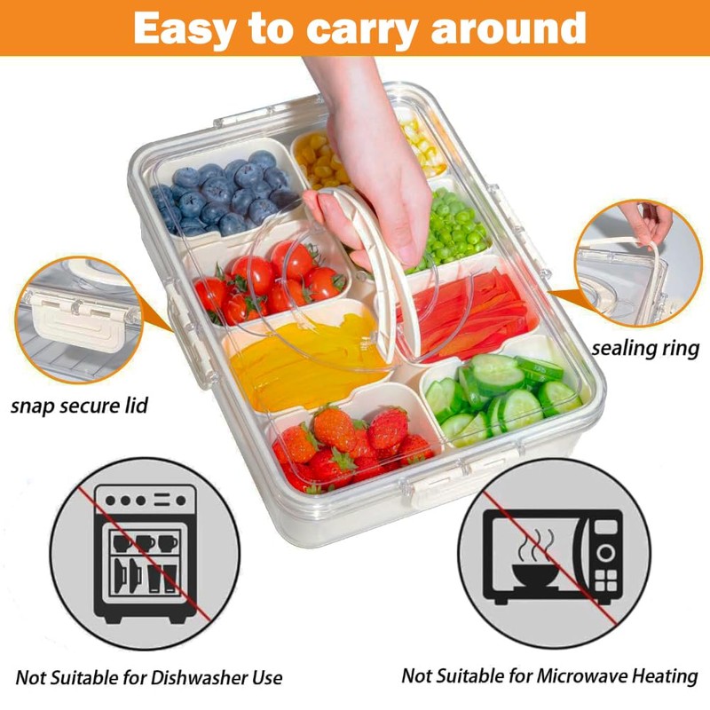- Veggie Tray with Lid - The 4/8 compartments snack containers comes with a lid that also has a buckle to keep your food fresh and protected. Safety lid holds snacks in place to prevent spills.