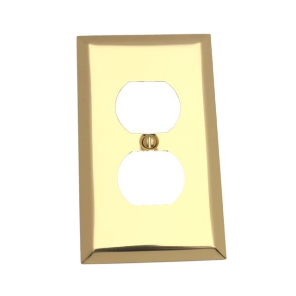 The American Tack Duplex Wallplate comes with a bright brass finish and is made of alloy steel plated with copper and brass coatings, and lacquered to prevent tarnishing, and cleans with a soft cloth.