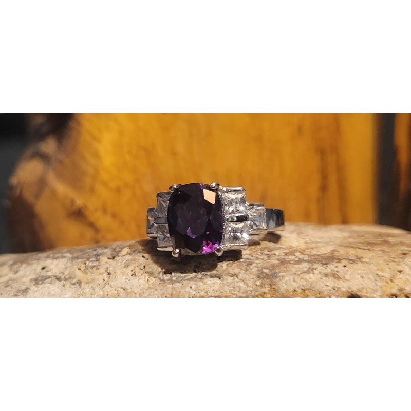 Add a pop of color to any outfit with this stunning cocktail ring. The oval, cushion cut lab-created amethyst stone is the focal point of the ring, accented by sparkling cubic zirconias set in a prong style. This ring is perfect for any occasion, whether it's a graduation, wedding, or Valentine's Day gift.