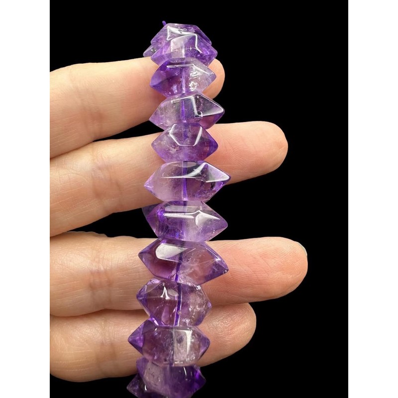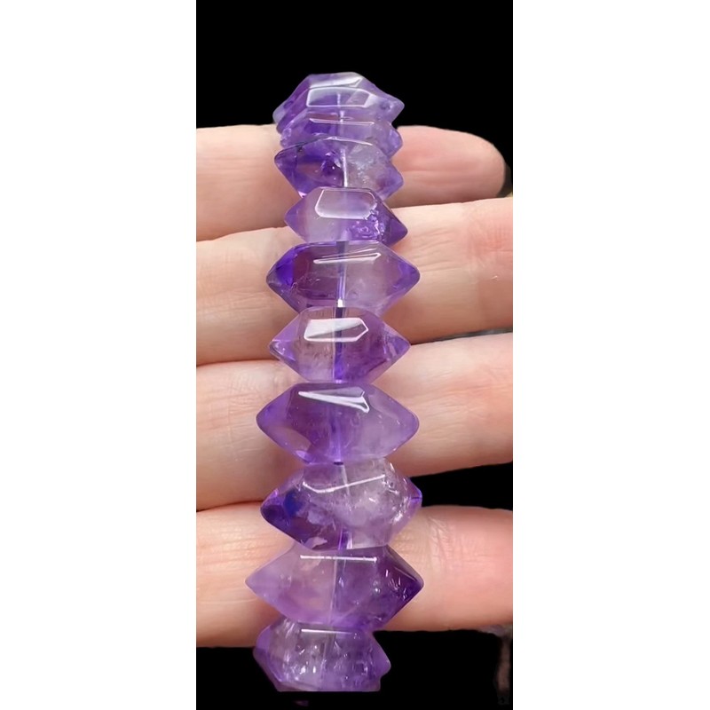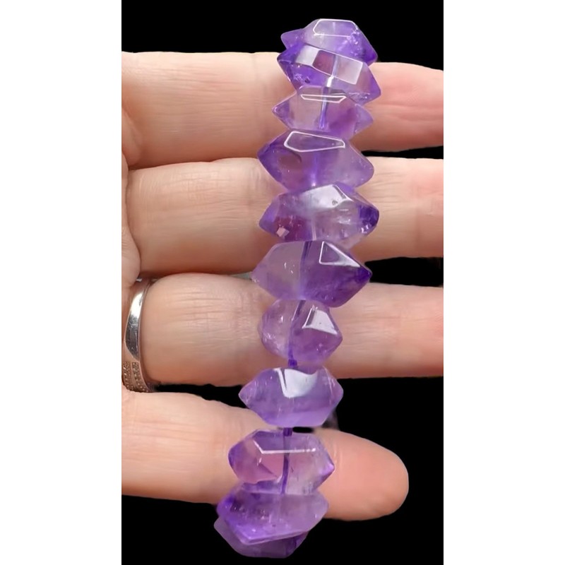 Amethyst double terminated point stretch bracelets! These are also smoothly polished and comfortable! The little points measure about 3/5ths of an inch (.6”) long, but vary because they were created individually. Since they are double terminated, they can be worn on either wrist as they can both give and receive healing.