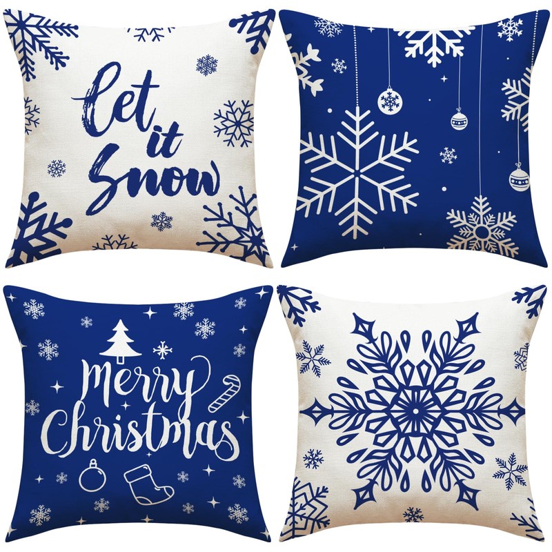 Ameyahud Merry Christmas Throw Pillow Covers Winter Holiday Snowflake Xmas Throw Pillow Covers 18 x 18 Inches Set of 4 Blue and White Cushion Case for Home Couch