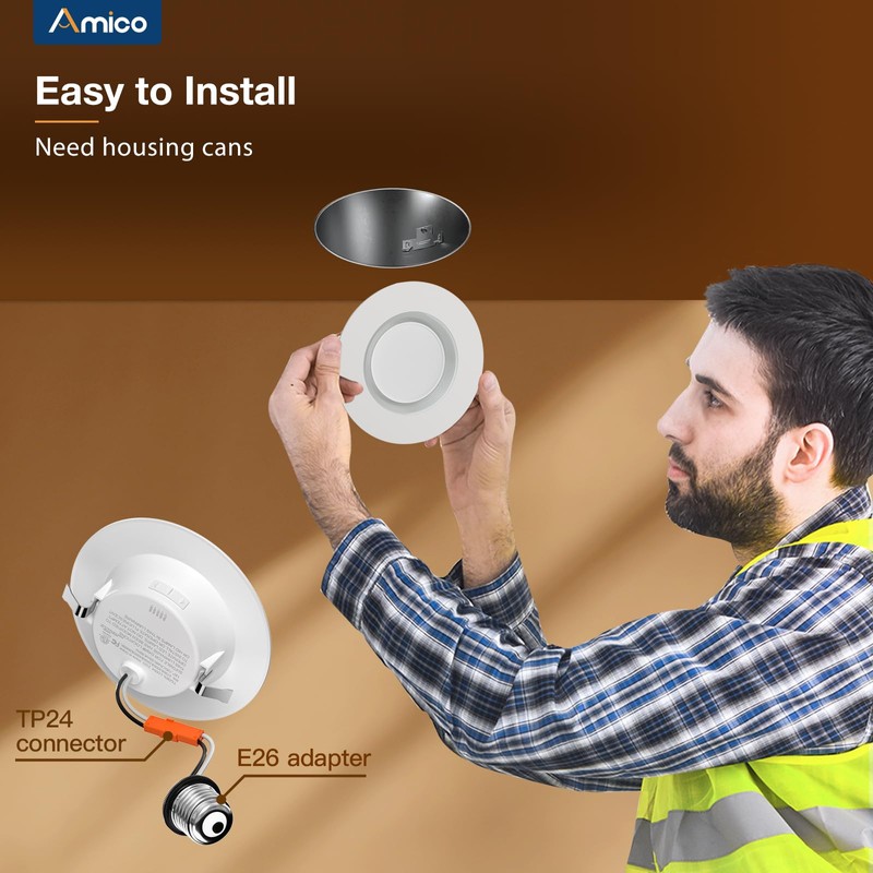 Amico 1 Pack 4 inch 5CCT LED Recessed Lighting with Night Light, 8W=60W, 700LM Can Lights with Baffle Trim, 2700K/3000K/4000K/5000K/6000K Selectable, Dimmable, Retrofit Downlight - ETL & FCC