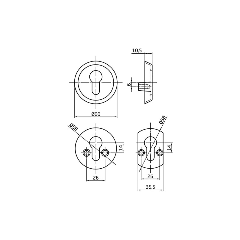- Details: for doors with a thickness of min. 40mm The protective shield (diameter 60 mm) protrudes 10.5 mm high. Screw hole spacing: 26 mm Zamak is a hard material that can withstand well due to its composition with multiple metals.