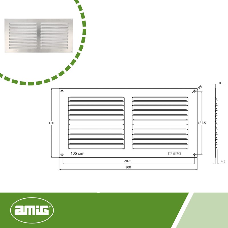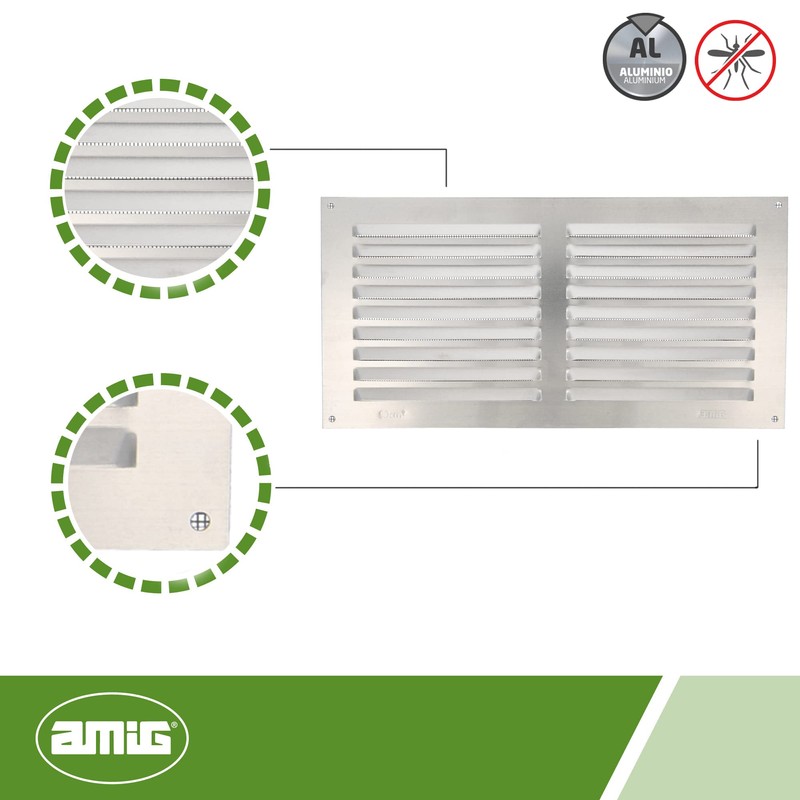 - DESCRIPTION: The Amig aluminium ventilation grille is an essential accessory for improving air circulation in your home or building. Thanks to its design, it easily integrates into any decor and is made from durable, resistant materials. The fine mesh allows for efficient airflow, keeping your space cool and comfortable. Additionally, it is easy to clean and maintain.