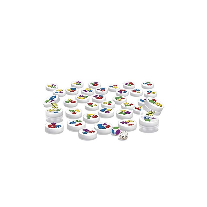 Bei "Klack!" spielen immer alle Spieler gleichzeitig: Einer würfelt und schon greifen alle nach den bunten, magnetischen Scheiben. Denn die Würfel geben Form und Farbe der Symbole vor, die auf den Scheiben zu sehen sein müssen. Schnell werden die richtigen Scheiben aneinander geklackt und wer am Schluss den höchsten Scheibenturm hat, gewinnt.