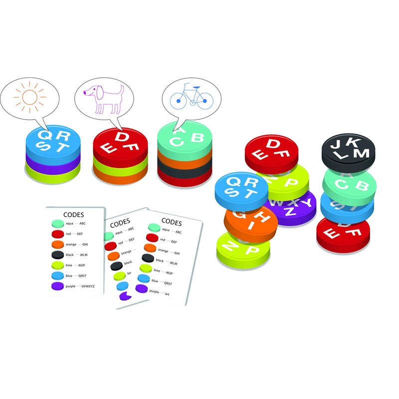 - 遊び方: カラフルなディスクを重ねてシンプルなコードで単語を作り、競争相手の言葉を書き出しましょう。