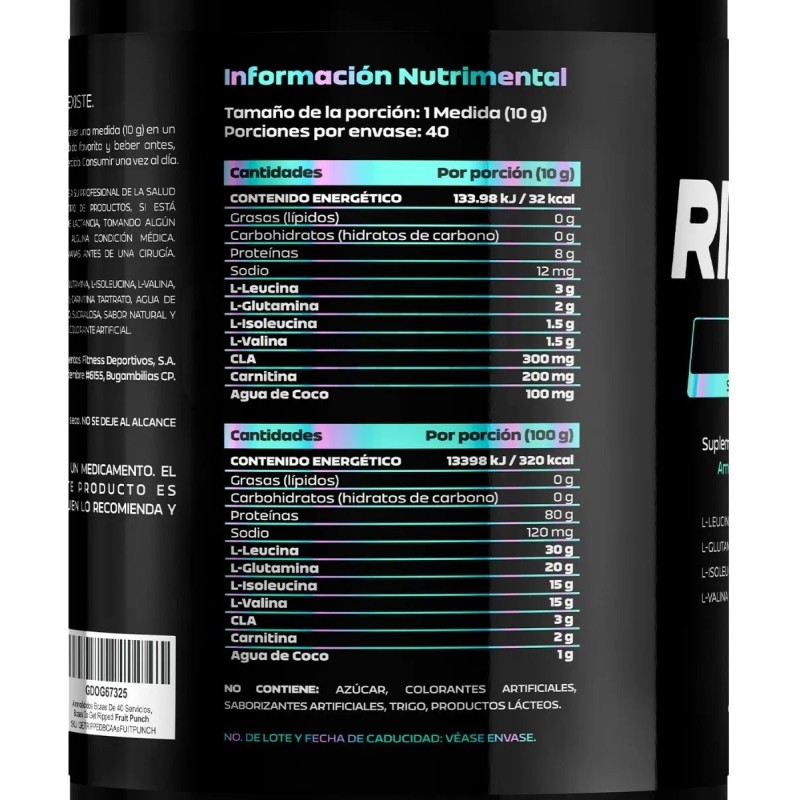 BCAAs 3X Fruit Punch de Get Ripped es una fórmula a base de Aminoácidos y Electrolitos con ingredientes de origen natural. Contiene L-Leucina, L-Glutamina, L-Isoleucina, L-Valina, CLA, Carnitina y Agua de Coco. Rinde 40 servicios de 10 gramos cada uno.