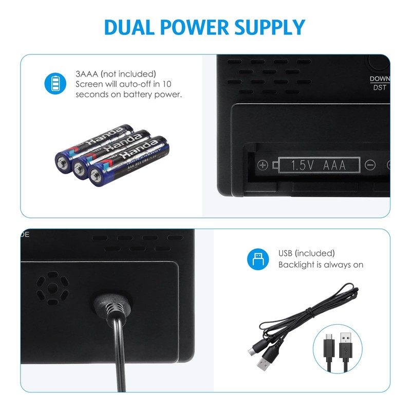 - USB & Battery Powered : For this dual alarm clock, coming with 1meter/39.37inch power cord (AC adapter is not included)- very good for battery saving. And it comes with time memory function when you charge by AAA batteries.(When powered by USB alone, there is no time for memory function after power off)