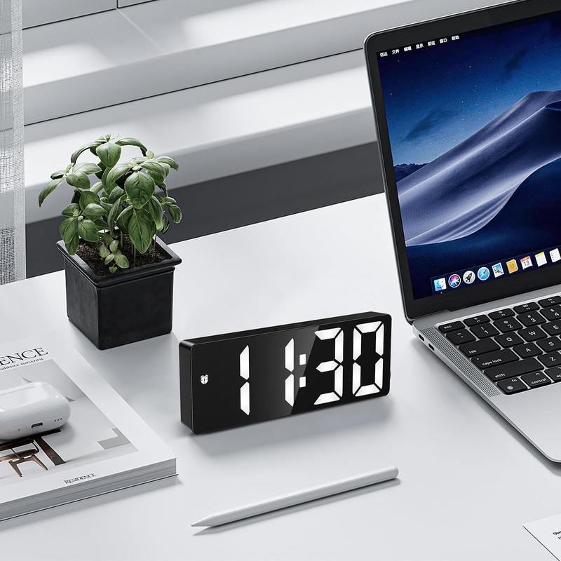 - Large Display & Multi-function: Digital alarm clock with large LED display (6.3"x0.7~1"x2.36"), which lets you check the time clearly at a glance even it is far from you. Our smart clock with 5 mode: clock mode, date mode, temperature mode, night mode (ON/OFF), alarm mode. The buttons on the rear are very self explanatory, so it is very easy to set up! The "colon" between the hour and minute display flashes continuously