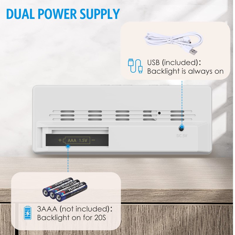 • 👍【USB & Battery Powered】There are two power supply modes of desk clock. When powered by USB: the alarm clock will always be on (the data cable length:1.5 meters , the plug is not included ); When powered by battery (not included): clock will automatically enter the power saving mode after 20S, also has a time memory function, no need to reset after power failure.
