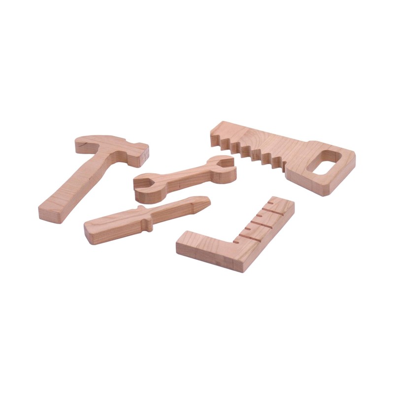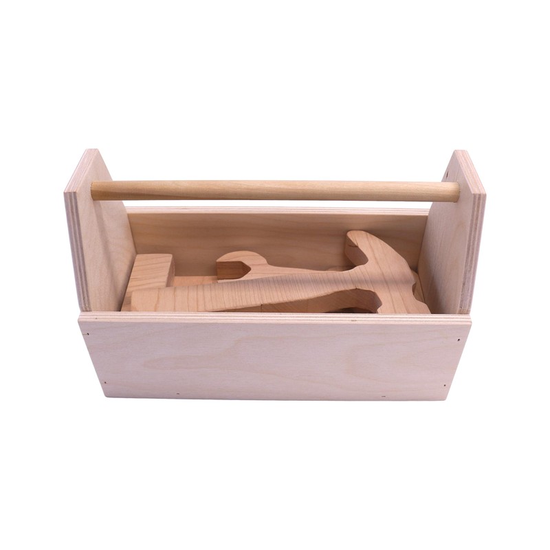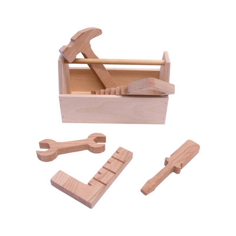 Delight your child with a wooden Tool Play Toy Set to "help" with the building projects around the house. The hand-crafted Tool Set includes an open-top Tool Box complete with a carry handle and 5 Tools (Hammer, Screwdriver, Wrench, Saw, and Square) made out of solid Cherry Wood. The Tool Set is made for us right here in Ohio by Justin, an employee of AmishToyBox.com. The 6 Piece Tool Set is unfinished for your child's safety and your peace of mind. The dimensions of the Tool Box are approximately 10"L by 5"W by 6"H. and the 5 tools are 3/4" thick and range in length from 6" to 8.5". .