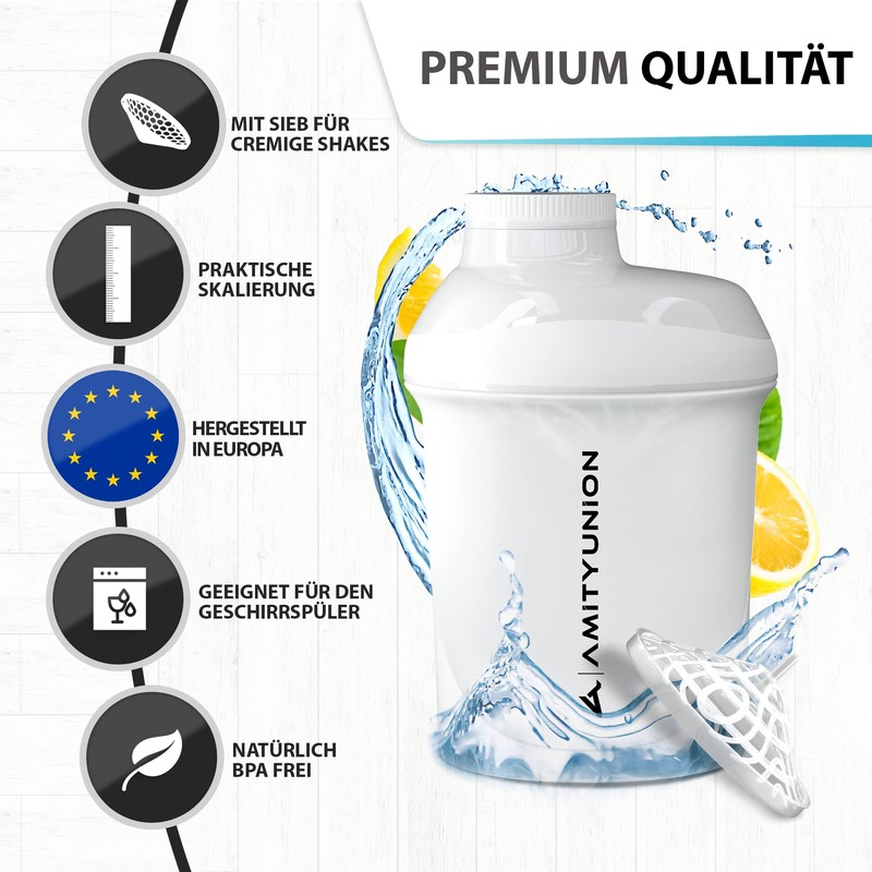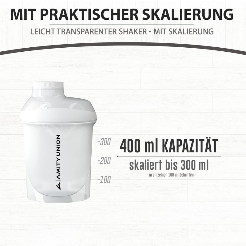 Amityunion Protein Shaker Deluxe 400 ml, Leak-Proof, BPA-Free Fitness Cup with Sieve and Scale for Creamy Whey Powder Shakes, Isolates, Sports Concentrates