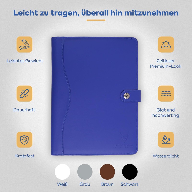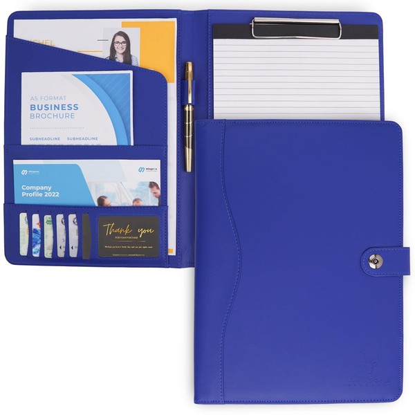 AMKSONS A4 Writing Case in Blue Including Clipboard & DIN A4 Notepad - Premium PU Leather Conference Folder with Document Compartments, Pen Holder, Flip Cover and Magnetic Closure