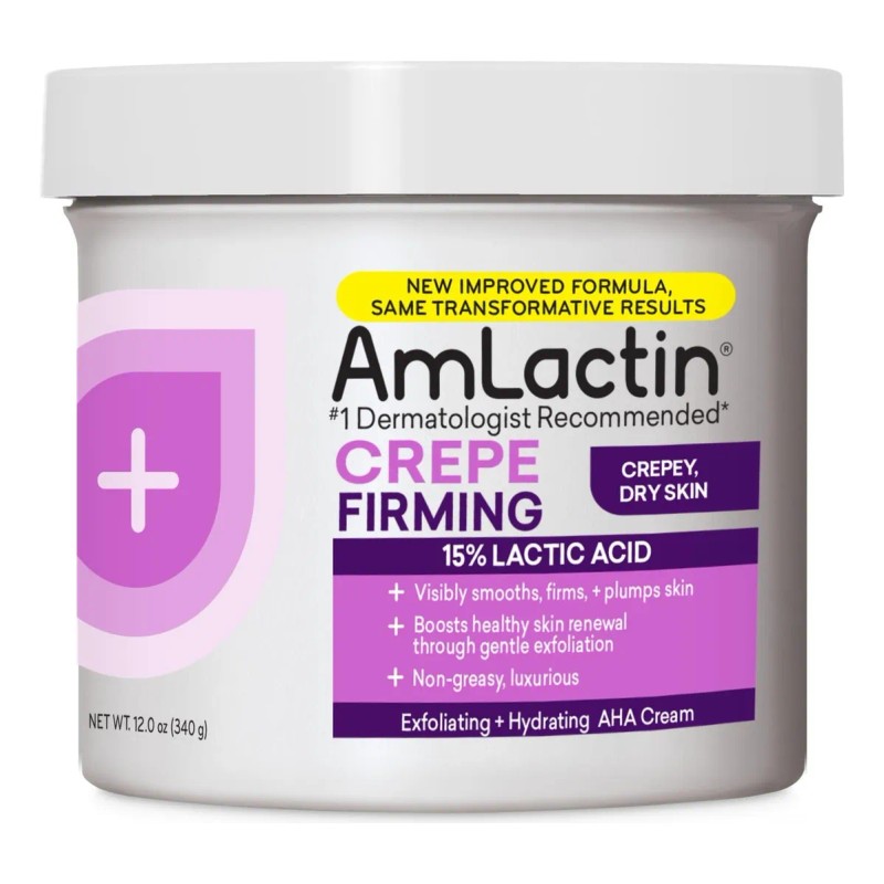 AmLactin Crepe Firming Cream, 12 oz es una crema hidratante para todo el cuerpo que ayuda a reafirmar y esculpir la piel, reduciendo la apariencia de la piel con aspecto de papel crepé. Su fórmula utiliza un 15% de ácido láctico para exfoliar suavemente y promover la renovación celular de la piel, mientras que los ceramidas retienen la humedad y apoyan la barrera cutánea. Esta crema es un exfoliante y hidratante en uno, lo que simplifica tu rutina de cuidado de la piel. Libre de parabenos y fragancias, esta fórmula rica e no grasa hidrata al instante para rejuvenecer la piel y recuperar un aspecto más joven. AmLactin es una marca recomendada por dermatólogos que trabaja con tu piel para potenciar su proceso natural de renovación a través de una exfoliación suave. Ideal para la piel delicada y seca.
