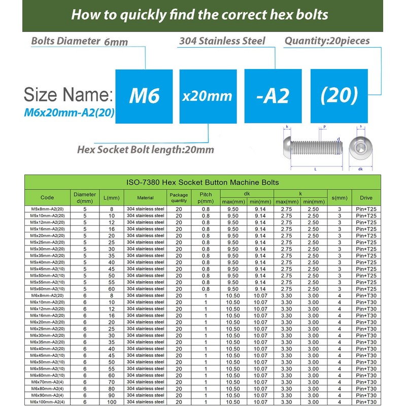 - M6 Hex bolts Thread Size--20mm Length (L), Socket Head (s)-4mm, Head Diameter (dk)-10.5mm, Head Length (k)-3.3mm, Pitch-1.0mm, Drive-Pin+T30