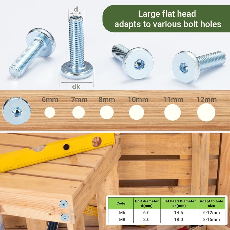 - Wide Application: large flat head bolts are mainly used for connecting various furniture or parts, such as crib, workbench, bed, table, chair, cabinets, boards, cupboards and other furnitures.