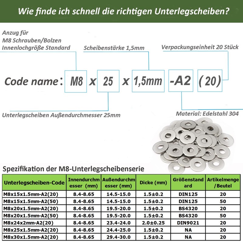 AMLOOPH Washers M8, Large Flat Washers M8 x 25 mm Thickness 1.5 mm Stainless Steel Washers A2 V2A (Pack of 20) M8 Washers Stainless Steel for Screws & Nuts & Threaded Rod