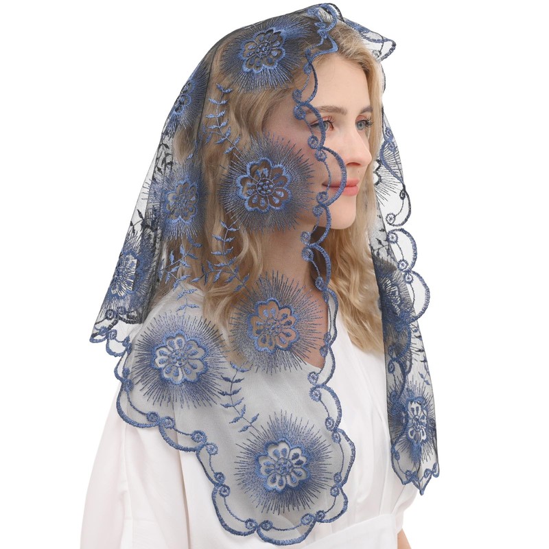 Ammmscaf Chaple Mantilla - Velo de iglesia católica de masas para mujer, con encaje tradicional para cubrir la cabeza, Azul y Negro, 47.3" across by 23.6"