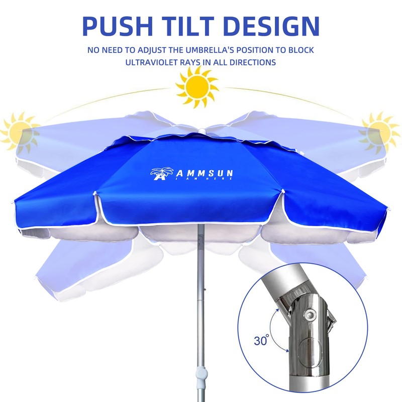 - PUSH BUTTON TILT & AIR VENT DESIGN: AMMSUN portable travel beach umbrella features a two-way tilting mechanism that allows you to adjust the shade and block the sun quickly without moving the umbrella, you can enjoy cool shade from sunrise to sunset