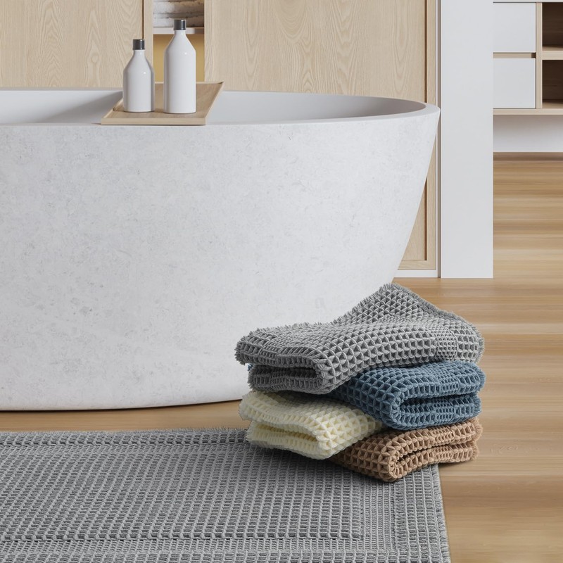 - [Upgraded Waffle Bath Mat] Featuring a unique waffle design, our boho bathroom rugs can bring a touch of art to your bathroom. Woven with upgraded yarn, these absorbent bath mats for bathroom non slip is a combination of beauty and durability. Heavier and thicker threads are applied to make the grey bathroom mat more solid and never out of shape.